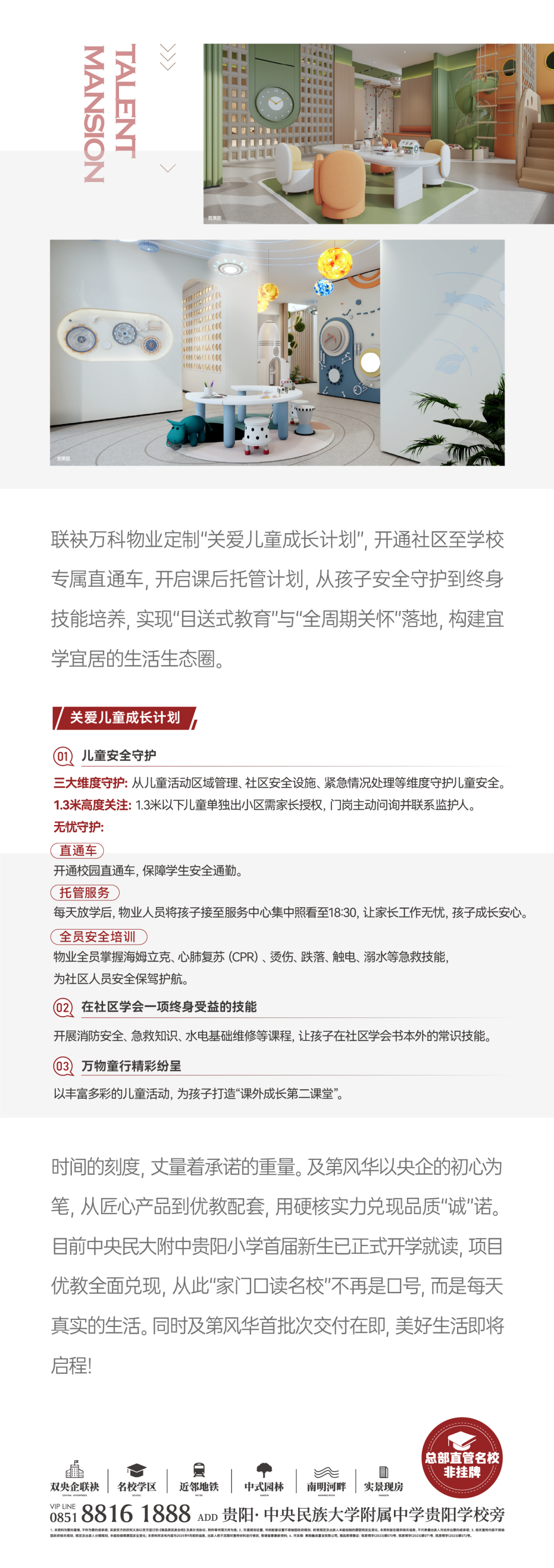 对于每一位家长而言,孩子的教育是头等大事,而“家”也是孩子成长的重要基地。及第风华,打造独属于贵阳的状元岛,在社区规划中融入“全龄教育”理念,打造58万㎡新中式住区、6大成长主题架空层,通过家门口的名校资源共享、课程共建、活动共融,为家庭提供“校内外无缝衔接”的教育支持。