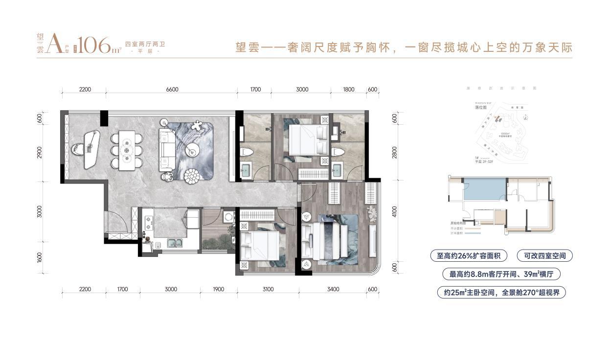 在产品设计上,洋浦·头号山也独具匠心。项目定位改善型客群,推出106㎡的平层和122-137㎡的跃层产品。平层主力户型106㎡四房两卫,宣称“负公摊”,赠送约27㎡,实得约133㎡,打造6.6米横厅、独立玄关及U型厨房,主卧多面采光设计提升舒适度。跃层王牌户型122-137㎡四房三卫,赠送面积优势突出,122㎡实得196㎡、137㎡实得213㎡,利用率超60%。其中,122㎡户型客厅及106㎡户型主卧设有270°转角落地窗。全系2梯3户设计,在保证居住舒适度的同时,也提高了通勤出行效率。