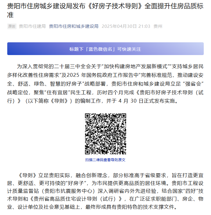 信息来源于:贵阳市住房和城乡建设局公众号2025年4月30日发布【贵阳市住房城乡建设局发布《好房子技术导则》全面提升住房品质标准】