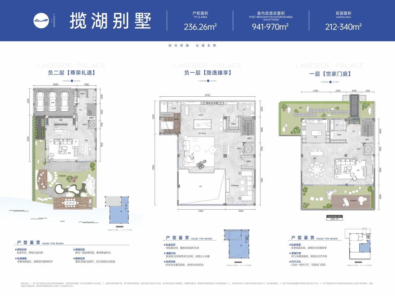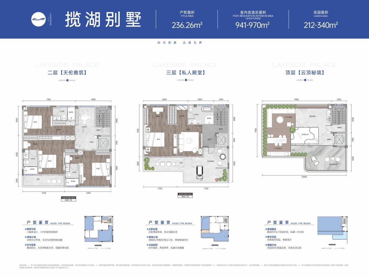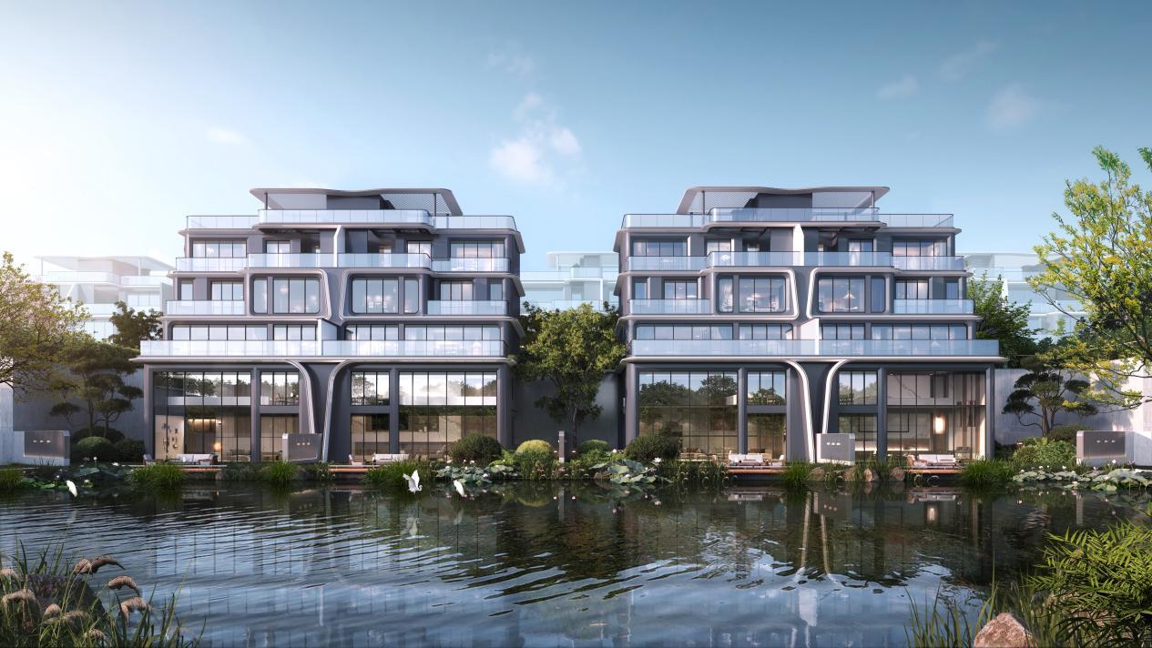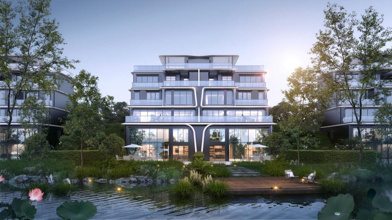 临湖院墅:28栋地上3层纯墅产品临水而立,建筑面积约168-235㎡,最高实得面积可达约1100㎡,享约164㎡湖畔院落。
